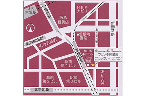 google mapを見る 【所在地】 〒530-0057大阪市北区曽根崎2-7-2梅新ビル1階 【アクセス】 地下鉄谷町線東梅田駅より徒歩1分JR大阪駅、阪急・阪神・地下鉄御堂筋線梅田駅より徒歩5分 【TEL】 06-6360-6747 【営業時間】 17:30~2:00(月~木)17:30~5:00(金・土) 【定休日】 日曜日 【その他】 御堂筋沿いヒグチ薬店となり
